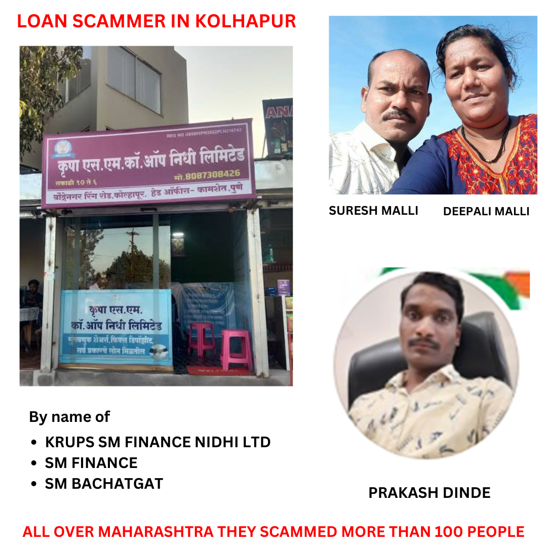 Financial deepali suresh malli scammer lady-sm krupa finance/sm finance/sm bachatgat akol July 16, 2023 Leave a Comment krupa sm cooperate nidhi ltd fraud krupa sm cooperate nidhi ltd scam deepali suresh malli suresh basappa malli prakash dinde loan scam cheques- by name of suresh malli or krupa sm finance nidhi ltd bank chques- hdfc bank, rbl bank