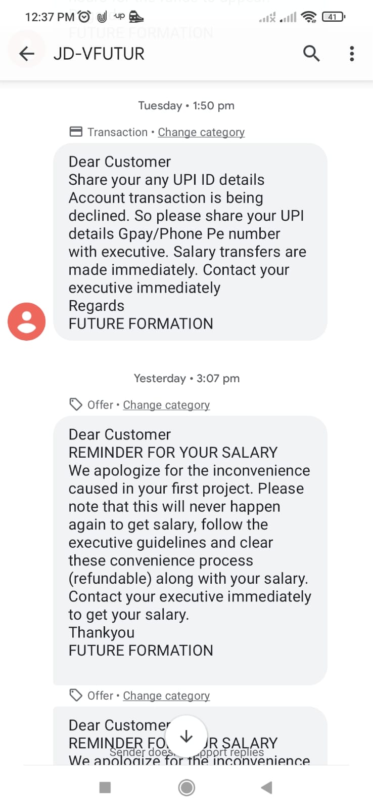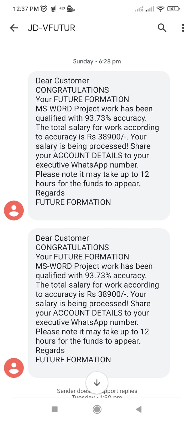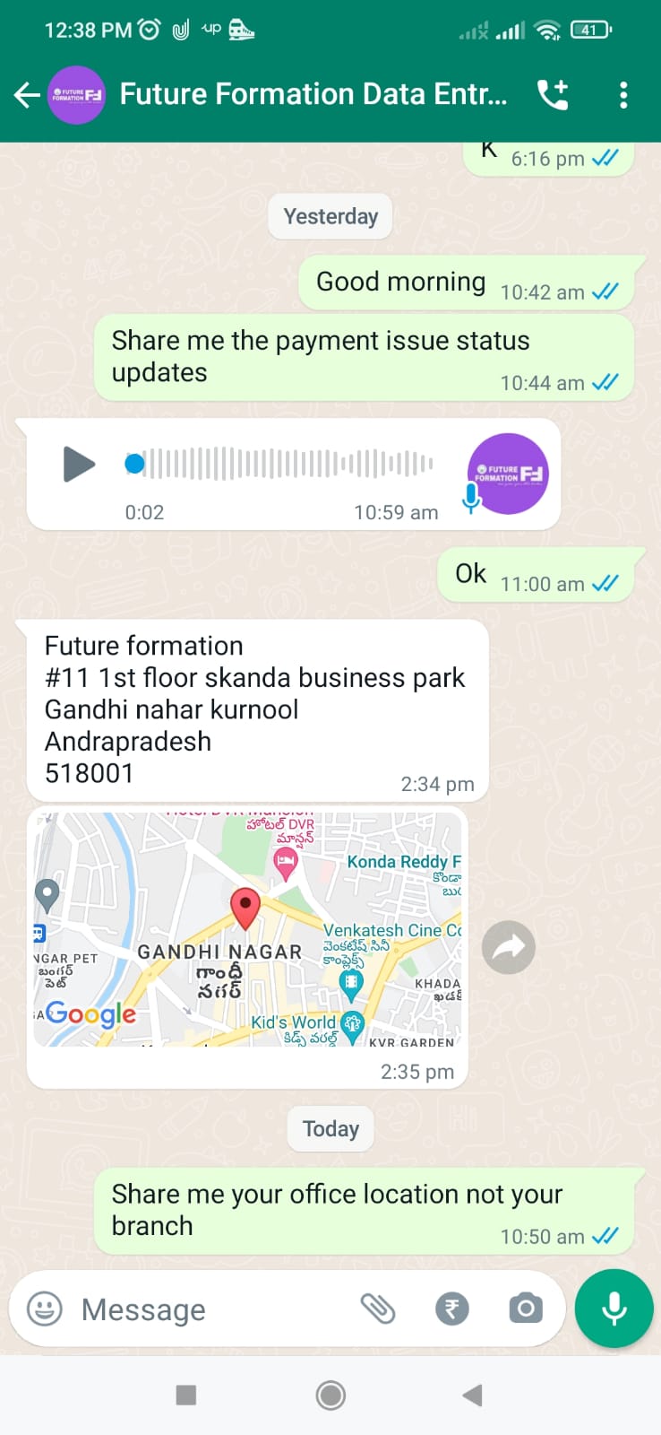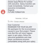 Then i told one option to them you can take my service charges amount from that amount and pay the balance amount to me , They are not accept that they need money from me and they will pay me within 10 minutes, I dont trust them so then I try to get there office details they send me fake location with fake address , I had the mobile number of executive call me the mobile number is still active but they are not giving me there real address and details still no reply of any messages also from me, I am not sure they are going to reply me or contact me again. Still they trying to message through online with another message ..(REMINDER FOR YOUR SALARY..We apologize for the inconvenience caused in your first project. Please note that this will never happen again to get salary, follow the executve guidelines and clear these convenience process (refundable) along with your salary. Contact your executive immediately to get your salary .Thank you ..FUTURE FORMATION) (This is the final Message coming again and again)