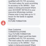 They gave me a target days to complete the work ,My work is type Image file to MS Word 145 pages, I completed my work within 8 days and send the project file send to the mail as they said. They verify my project file and send me reply within 2 days my accuracy level is 93.73% and according to my accuracy level my salary is 38900 RS. Next day they ask me for my account details to transfer money i send to them and next they another message arrived they cant transfer to my account payment is declined due to some other issue so they need my UPI ID , so i also send my UPI ID too.
